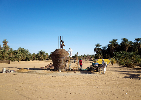 the "rajul al-thalj" (snowman) is made of sun-dried mud bricks and finished with white plaster. it is an attempt to reverse the very characteristics of a popular representation in terms of aesthetics, materiality and performance. the monumental recreation of an abstracted snowman in a saharan context performs no ritualistic or ceremonial function. it rather pays reverence to the birth of anthropomorphic figuration and the cultural environments where human ideotypes begin to appear.