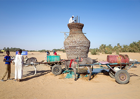 the "rajul al-thalj" (snowman) is made of sun-dried mud bricks and finished with white plaster. it is an attempt to reverse the very characteristics of a popular representation in terms of aesthetics, materiality and performance. the monumental recreation of an abstracted snowman in a saharan context performs no ritualistic or ceremonial function. it rather pays reverence to the birth of anthropomorphic figuration and the cultural environments where human ideotypes begin to appear.