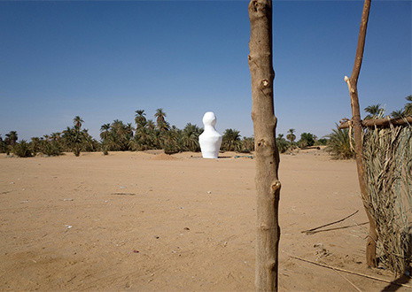 the "rajul al-thalj" (snowman) is made of sun-dried mud bricks and finished with white plaster. it is an attempt to reverse the very characteristics of a popular representation in terms of aesthetics, materiality and performance. the monumental recreation of an abstracted snowman in a saharan context performs no ritualistic or ceremonial function. it rather pays reverence to the birth of anthropomorphic figuration and the cultural environments where human ideotypes begin to appear.
