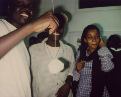 faustgrosse bälle aus gepresstem firnschnee der bündner berge finden sich nach langer und beschwerlicher reise in den räumlichkeiten des französischen kulturzentrums in khartum. von der decke hänge weisse schnüre und daran - auf unterschiedlicher höhe - die schneebälle, die für kurze abendstunden wie kleine monde leuchten. hier hat es - soweit sich menschen erinnern können - nie geschneit; und doch versteht das publikum die geste, nimmt das geschenk an und löst die schneebälle aus den schlaufen. kinder und erwachsene werfen sich die bälle zu, halten sich den schmelzenden schnee an stirn und wangen und erfrischen sich heute an den kleinen monden und morgen an der erinnerung an eine kühlung, die aus der ferne kam.