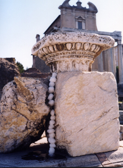 "wir haben zeit, wir warten auf den schnee der uns nach rom weht", schreibt heiner müller in anatomie titus an der stelle, die den sieg der goten über die römer beschreibt. die poetische dimension dieses textes bildet den ausgangs- punkt für eine reise mit zwei dutzend schneekugeln ins sommerliche rom. im forum romanum - stein gewordenes zeugnis der römischen zivilisation - wurden die kugeln an einem kapitell aufgereiht und sind mit der spolie zu einem fragilen plastischen gebilde verwachsen. anatomie titus bringt fremdes zusammen und schafft dadurch neues: den steinernen fragmenten aus fernen jahrhunderten der "ewigen stadt" wird etwas leichtes und zeitloses beigestellt. für kurze momente steht altes neben neuem, stehen geschichte und gegenwart in einem prekären gleichgewicht zueinander.